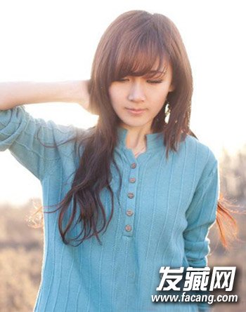 微卷的长发随意的披散下来,营造出唯美浪漫的气息,轻盈的齐刘海不仅修饰了脸型,也展现出mm清新甜美的样子。