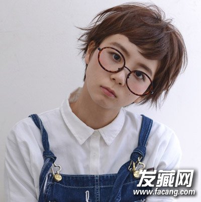 利用短刘海装假小子也是不错的选择,这款短发内层柔顺贴服,外层发丝则烫出凌乱的感觉,短短的刘海带点内扣微卷,再戴上复古的圆镜框,时尚又帅气!