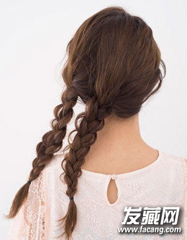将两部分分别便两个三股辫,两个三股辫要在同一侧,不能分开。都要拉扯蓬松。