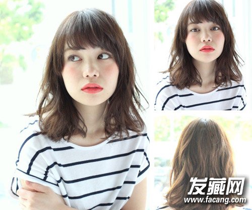 一九分斜刘海及眉修饰脸型搭配短鬓角头发修饰出小脸,凌乱随性卷发展现妹子独特个性。