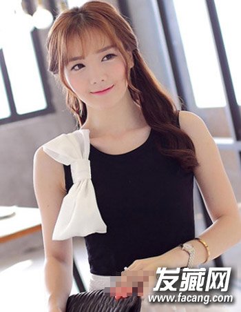 清新的空气感刘海一直以来都是女生们的最爱, 再一种时尚的棕色染发设计与半扎式的长卷发公主头更添女生十足的清纯甜美淑女风。
