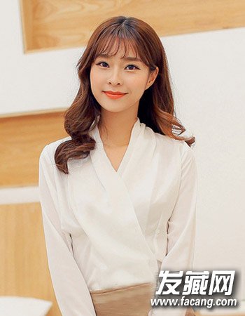 一款略显女生的清新优雅风式的女生齐刘海中长发发型,同样是清新灵动的空气感齐刘海造型,而配合温暖的棕色染发与简单的小卷式中长发温柔优雅同样吸睛。