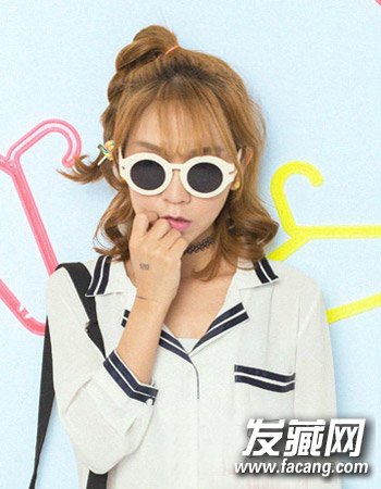 潮流感十足的浅色系卡其色染发颜色最能衬托出女生肤色的白皙感了,而空气感的刘海发型设计与半扎形式的中短发蛋卷头更添活泼可爱甜美风。