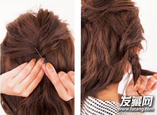 step1:将头顶部分的头发在脑后蓬松扭卷,用发夹固定。