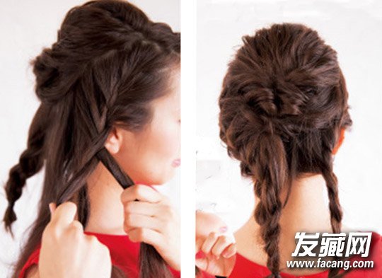 step4:如图,九的那部分头发编织到后颈中间,剩下部分变成三股编继续编织。而一的部分编织到耳后就编成三股编。