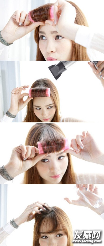 【打理步骤04】如果你是头发较细的女生,最好就利用发卷的时间长些,而发质较粗的女生可以在吹发完成之后将发卷放下,这时空气刘海已经基本成型咯!
