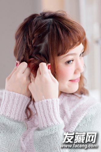 步骤一:将发束平均分成3等份后从耳朵上方开始编织。为避免发型散乱,尽量编的较紧。