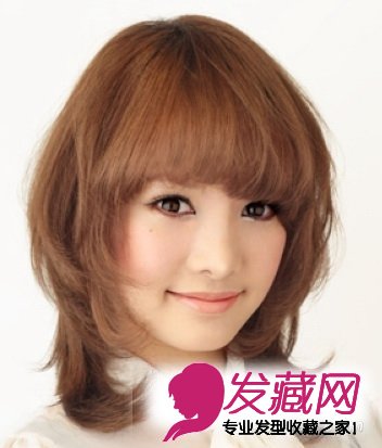 弧度形状非常漂亮的刘海使扁脸型的MM五官立体了,脸颊两侧渐长的发梢往内卷弧度用来修饰颧骨高或者肉肉的脸颊不错哟。