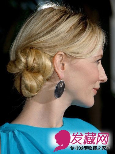 经典盘髻像凯特•布兰切特一样梳在一侧的不对称发髻最适合搭配一款较大的发饰,耳环也可以加分不少。