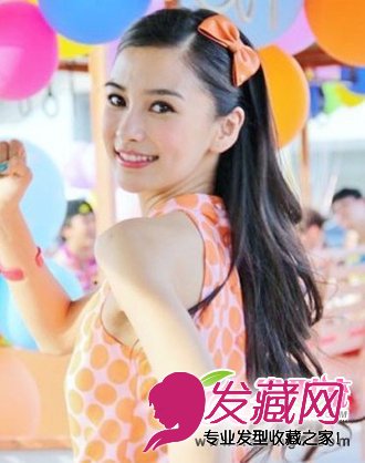 嫩模出道的Angelababy现在绝对是炙手可热的人物,最近上映的大片都有她的美丽身影,极具亲和力的微笑,活泼开朗的个性让大家非常喜欢,柔顺的黑色长发发型打造出简单的马尾造型,青春活力四射,再别上橘色的蝴蝶结甜美可爱。