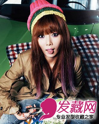 这款简单的长直发发型搭配上绚丽个性的挑染染发发色,棕色到紫色再到白金色的渐染,潮流个性十足,层次感的直发发型设计,青春动感气息尽显,搭配上毛线帽子,散发出一丝嘻哈风格,帅气又可爱。