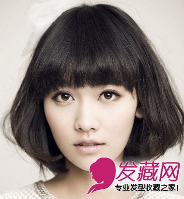 加厚的齐刘海起到很好的修颜效果,及肩的内扣微卷梨花头则带着淡淡的小女人的甜美感觉。
