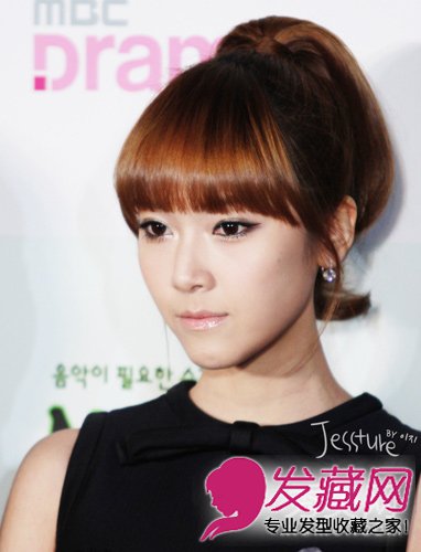 巧克力色染发加齐刘海马尾,不要以为只是普通的马尾,你看的到皮筋在哪里吗。是的,重点就在这,用头发遮住皮筋可是今年很流行的做法哦