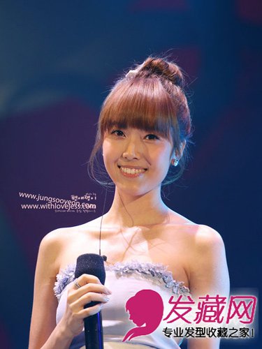 日常发型怎么少的了韩国女生最爱的花苞头呢,栗色的染发给花苞头不一样的感觉,两边垂下来的发丝,有很好的瘦脸功效哦
