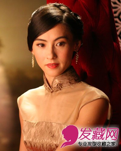 侧分的刘海微微斜过脸庞,能很好的修饰脸型,脑后的盘发则很好的体现出其高贵的气质,是经典的复古发型,再配上美丽的旗袍,温婉而又大方