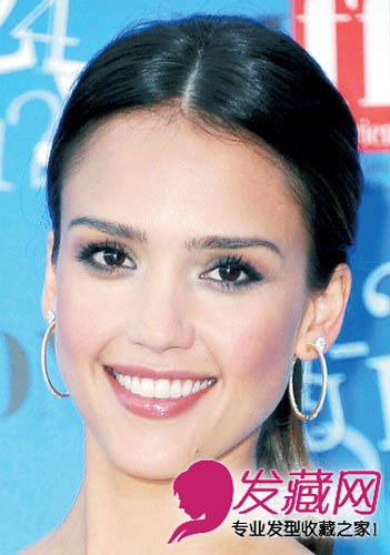 看到这张图片是不是迎面有阵风伴着甜柠檬的味道?相较梳光的高马尾,前面中分增加了层次感,配合精致清新的妆容和圆形大耳环,perfect!