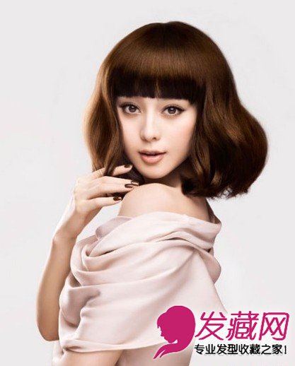 光滑柔顺的头发在耳朵上方打造了一个弯卷,紧接着下面是一个很大的荷叶状得卷度,给人优雅轻灵的感觉。厚重的齐刘海显示了范美人纯真、率直的个性。知性和温柔共存的女人做最惹人爱。