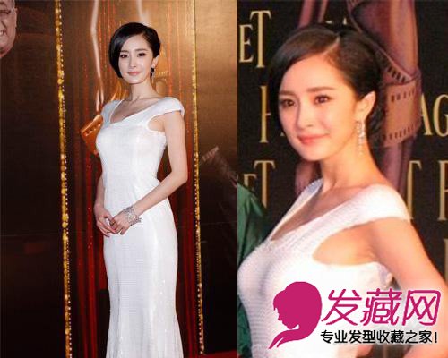 侧分刘海盘发这款发型的刘海正好垂到下巴处,不仅遮住了右侧大部分脸颊,也因为分割的作用呈现出锥子脸视觉效果。上部盘发蓬松鼓起,显得脸上部颇为饱满,自然也就显得下部纤瘦了。