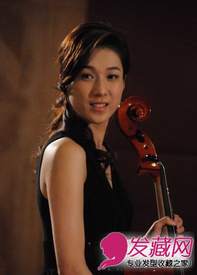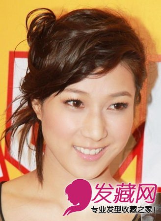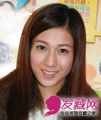 侧分的中长卷发很适合淑女清纯的钟嘉欣,柔顺的发质,充满光泽的发色,诠释少女般的清新风格。