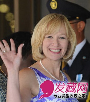 加拿大总理夫人劳琳·哈珀拥有一个设计公司,金色短发造型凸显她的奇特个性,同时金发与白皙牛奶肌肤相比,显得优雅而低调。