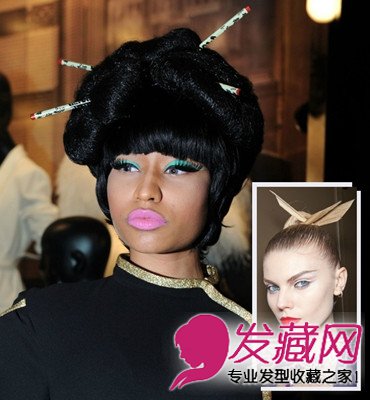 Nicki Minaj因这款厚重的发型而着名,她改良了Zac Posen秀场中模特们具有日本和风灵感的发髻。加上筷子和假发,将优雅时髦的秀场造型革新成她小我私家气势派头的庸俗夸张,也只有Minaj能做到了。