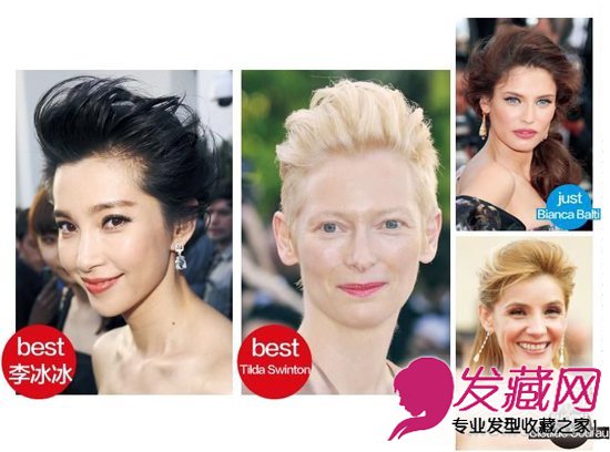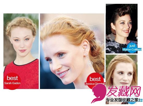 Sarah Gadon和Jessica Chastain的编发,一个复古优雅,一个高尚大气,均可谓女明星红毯发型的范例,着实难分伯仲。不难看出,Jessica Chastain除了女神范儿,还可以轻松胜任另一类造型,只将偏分刘海儿部门的头发随意编起,别在耳后,慵懒又活力十足,只是此发型好像过于“青春无敌”,年轻10岁的女人快来学起来吧!隶属于技巧派的Marion Cotillard,这次的发型委曲归于此类,虽然稍显“怪异”,但也美得想要多看一眼。前额丰满的发髻,虽然只用旋拧的手法就可完成,但要做到此般“浓淡相宜”,就要靠平时的潜心训练了。