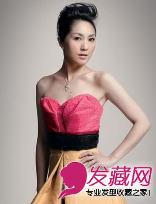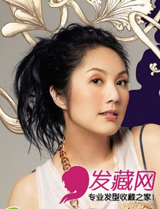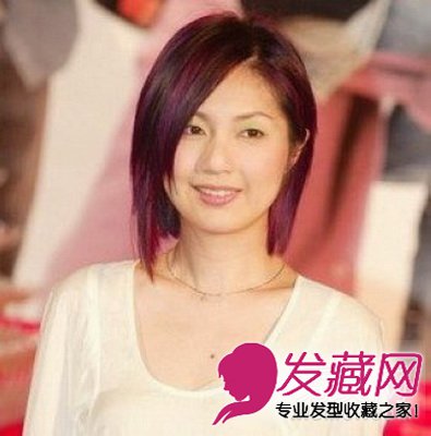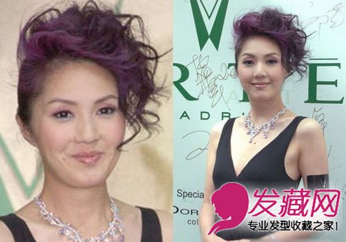 在头后部高高地扎起一个可爱的丸子头,配上杨千嬅奇特的笑容,甜蜜可爱哦!将所有的头发扎起来,紫色的染发色提亮了整款女生发型的光泽度,简练大方。