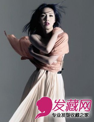 这款发型有些朋克气质,将刘海做卷看起来很有活力,切合杨千嬅活跃的个性,发型也让玄色的制服不再沉闷。紫色的发型似乎是杨千嬅的标志,看起来很个性;冷色调也不会显得燥热。
