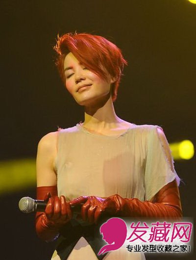 广州演唱会上王菲以全新造型亮相,为配合新歌服,她更将留了六年的长发剪短及染成火红色,令人眼前一亮。红色头发、红色眉尖、红色腮红、红色手套、红色坎肩、红色短裙,王菲很是“红”!