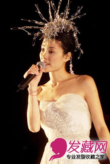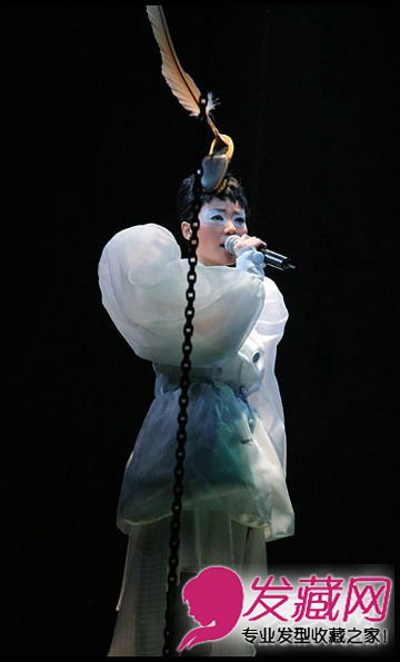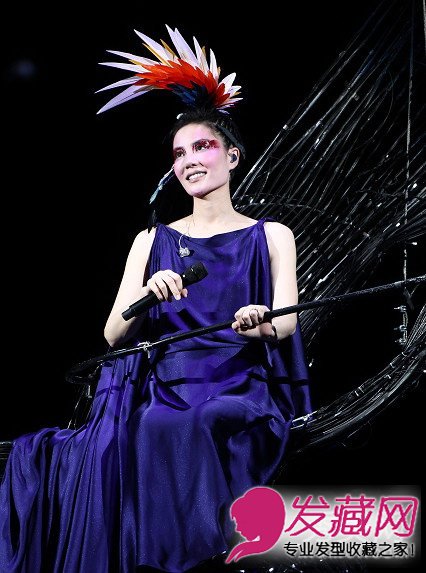 但看简朴清新的盘发并无特殊,但搭配上夸张的头饰就别有一番风味了,色彩鲜艳的羽毛,只有真正的王菲才气驾驭它。