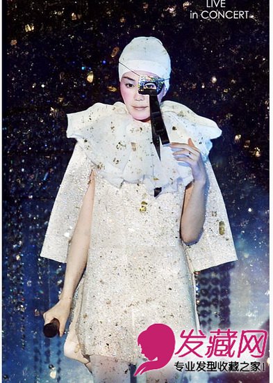 王菲复出后的巡唱,在造型方面自然也是花足心思。但最令人惊艳的还要属这款“尼姑”造型了。白色毛巾的大浴袍装好像一个蚕茧一样将她困绕,白色的帽子既像是泳帽,却又像是古装港片中的“尼姑头套”。妆容则是淡雅裸妆,只在眼周轻轻地抹了一些紫色的眼影,配合纯白色的服装,很是地惊艳。