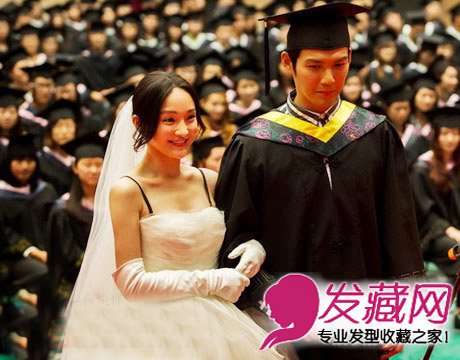 周迅娇俏的白裙,中分新娘盘发戴上头纱十足浪漫,钟汉良黑色学士服,学士帽,加上俊朗的外貌,绝对是秒杀校草。