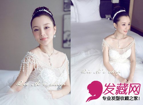 怀孕后略显圆润的脸庞透露着初为人母的幸福,高贵气质的盘发发型配上洁白的婚纱很显气质,蓬松的裙摆很好的修饰了身形,让大肚婆也一样很吸睛,高高耸起的盘发搭配珍珠的发饰,很是清爽高贵,甜美的笑容将幸福传递开来。