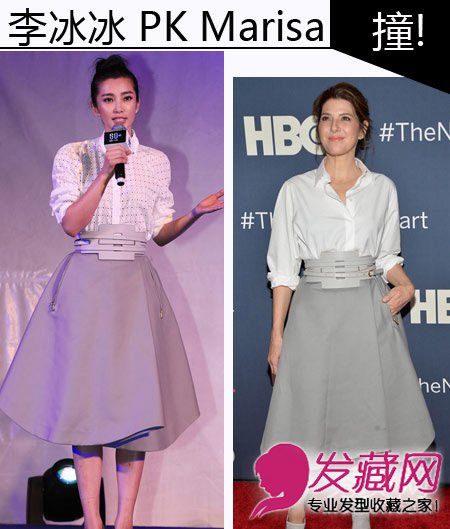 李冰冰这也是撞衫的大热门呀,这款衬衫和半身裙的搭配很很是清凉有气质,文艺范十足,两位女星相比,李冰冰的丸子头发型超级显高,高腰的设计更显修长。