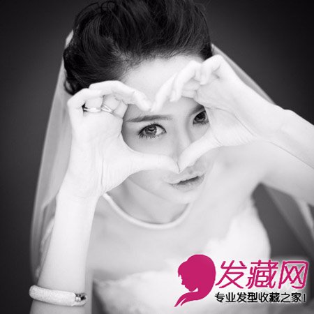 做出爱心手势,沉浸在幸福中的小女人,简约的新娘发型,婚纱照,表情俏皮可爱。
