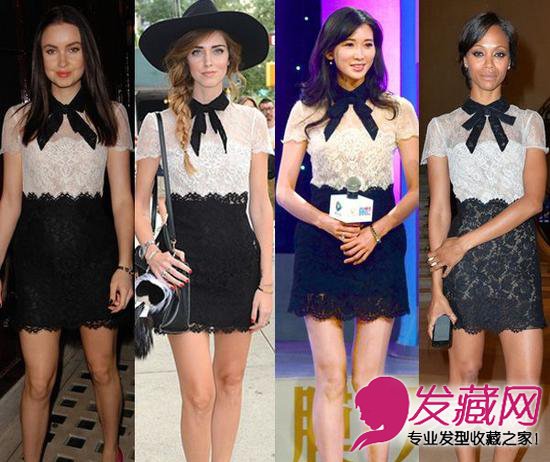 艾玛-米勒(Emma Miller)身穿Valentino黑白礼服出席凯特-莫斯时尚派对,与时尚博主Chiara Ferragni、林志玲、佐伊-索尔达娜(Zoe Saldana)撞衫。每个女人都不能抵挡蕾丝奢华精致的美,Valentino黑白相间的蕾丝小礼服更是将女性美好的身材、婉风流转的样子表达的淋漓尽致。仅靠这条精致的裙子就能激起男生无限的保护欲,但艾玛-米勒(Emma Miller)和林志林的披肩长发却因为裙子足够表达女性之美而显得多余累赘。佐伊-索尔达娜(Zoe Saldana)的利落后扎发让整个裙子变得平淡无奇,就像是马上要去办公室上班一样。相反地,时尚博主Chiara Ferragni用侧编鱼骨编搭配宽檐礼帽让整个女人味十足的礼服多了些许的魔幻气息。