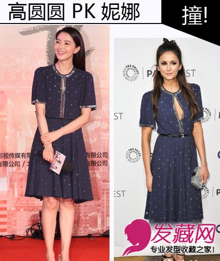 女神高圆圆现在是难得露面,一露面就跟别人撞上了!这款斑点雪纺长裙在夏天很常见,搭配高圆圆的自然中长发发型别样清新。但旁边这位外国女星的造型感觉就更加大胆,中空是设计小露酥胸,很是情感,半扎的公主头发型也很是甜美。