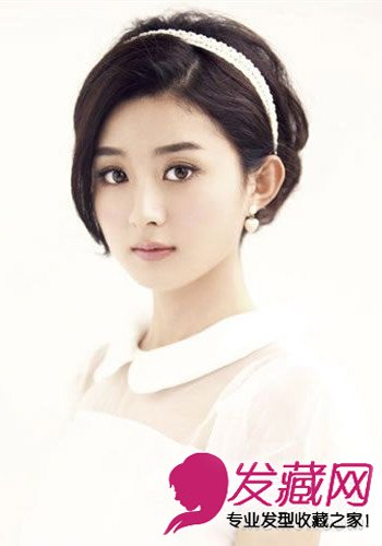 甜美的数岸边盘发发型,斜刘海盘发搭配白色的蕾丝发箍乖巧可爱,安静的好似天使。