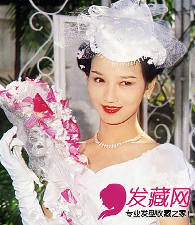 赵雅芝的结婚照,两边高的盘发造型让赵雅芝的端庄之美尽情展现,蕾丝 的帽子发饰,优雅的笑容,幸福感悠然而出。