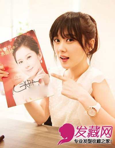 可爱的齐刘海发型,空气感十足的刘海扎成马尾辫很是甜美减龄。