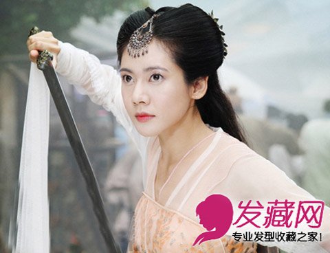 古装长发造型,发顶两侧的发髻略蓬松,额前缀上华丽头饰,散发出甜美艳丽的气质。