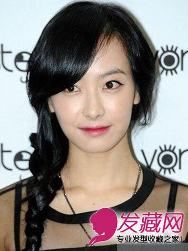 斜分刘海,侧放的黑色长发编成鱼骨辫子,加上淡雅韩式妆容,彰显清纯甜美范。