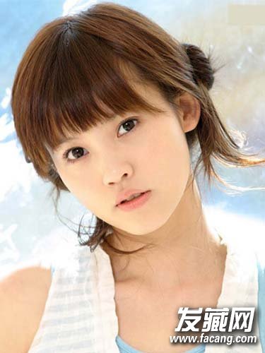 空气感刘海显示鹅蛋脸颊,棕色染发,简单扎到脑后,留下几缕发丝看起来很清纯。