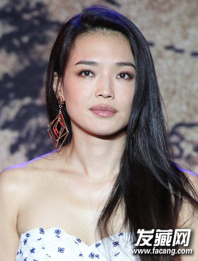 国字脸也称方形脸,特点是轮廓分明,极具现代感,给人意志坚定的印象,但不足之处是对于女性来说显得不够柔和。舒淇的方脸让她有一种特别的美,三七分长发随意撩起偏向一侧,一边露出夸张的几何图案大耳坠,一边遮住耳朵修饰脸型,性感不失精致。发丝随意的弧度增添了一丝柔美,中和了方脸强烈的轮廓感。几何图形的大耳坠搭配的恰到好处,时尚不失简约。