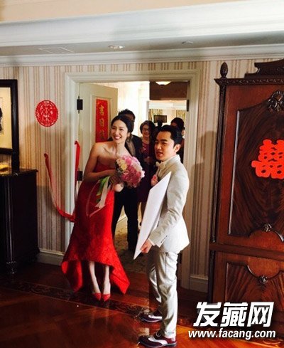 手拿捧花,中分的新娘盘发,一身端正的中国红礼服将喜庆渲染到极致,灿烂笑容感染众人。