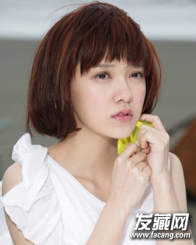 齐刘海bobo头发型,甜美修颜,酒红色染发,看上去优雅美丽。