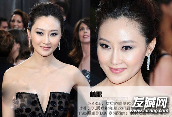 2013年,女星林鹏受邀参加第85届奥斯卡颁奖礼,裸妆搭配粗眉彰显优雅大气,简约韩式盘发婉约更显气质。