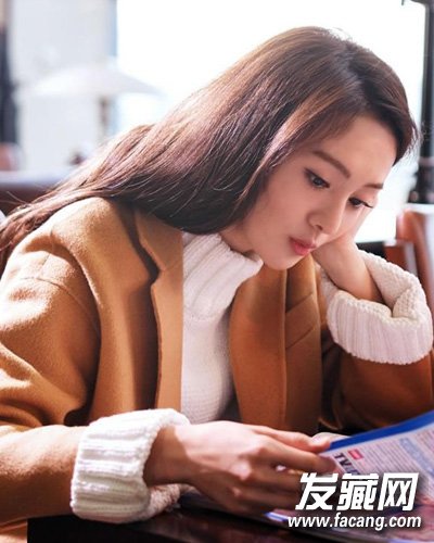 郑爽蓬松刘海卷发发型,浪漫披肩发搭配驼色大衣,很显OL范。