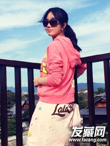 扎着清爽马尾辫的小苹果,休闲的学生范穿搭,带墨镜,充满着潮流酷感。