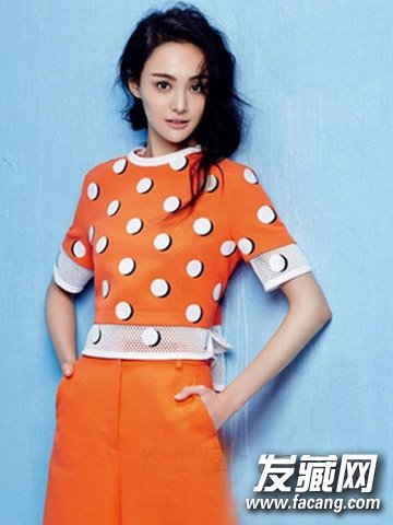 偏分发型,蓬松的发丝遮住半张脸,本来就瘦小的郑爽更显得娇小柔美,波点橘色套装,展现出率性女孩的独立大气。